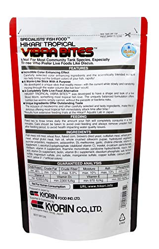 前から気になっていた魚のエサを購入しました。バイブラバイツという餌です。英語パッケージですが、製造も販売もヒカリ(おなじみの)で、メイドインジャパンです。