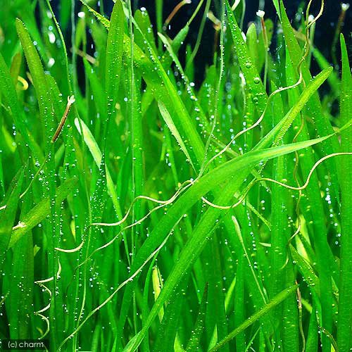 セキショウモ(バイスネリア)はいくつかの種類がありますが、種類により葉の幅が広かったり狭かったり、ねじれたりします。ホームセンターで買ったアクアリウムでバリスネリアという名で流通していたものです。葉の先端がよく見ると尖っているのでコウガイセキショウモではないっぽい。