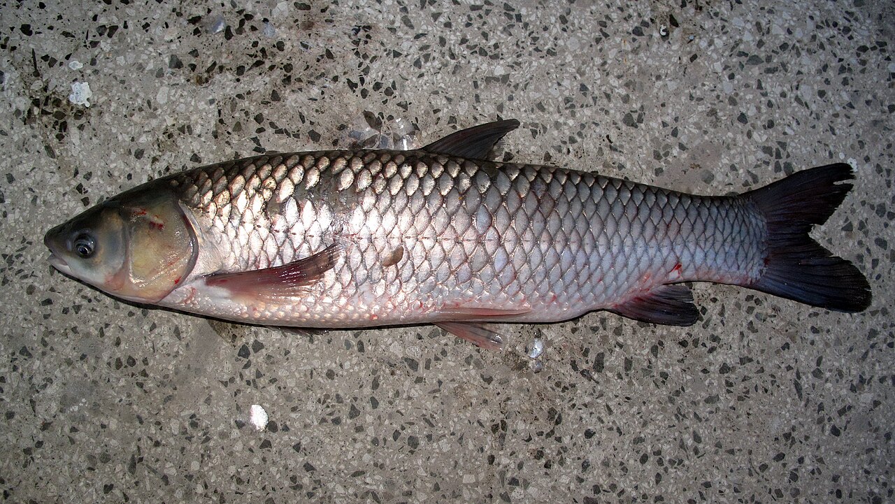 ソウギョは中国由来の外来種です。卵が孵化するには長い河川が必要で利根川以外では繁殖しないとされます。しかし、九州では放流されているので沿岸の川にいるんです。大きさは1m前後が通常サイズで、最大2mまで成長。毎日体重の3割の量の水草を食べる。詳しくはwikipediaなどを参照してください。