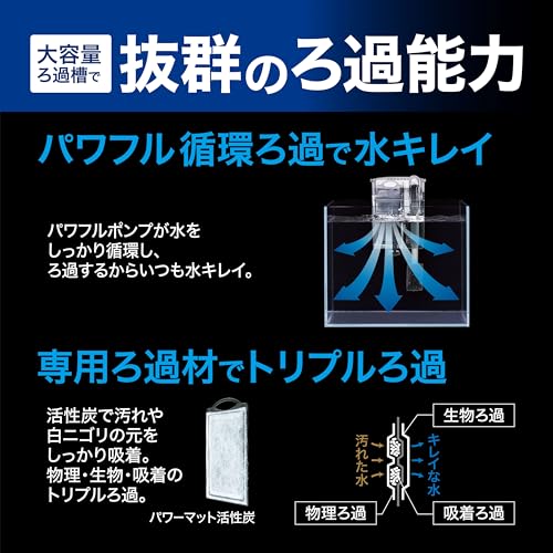 30㎝キューブや40㎝規格水槽は水量が約20リットル程度あります。実はこのサイズの水槽はジャストフィットなフィルターがあまりない。GEX外掛けMかLに投げ込みやフィルターや底面フィルターを組み合わせたらいいでしょう。
