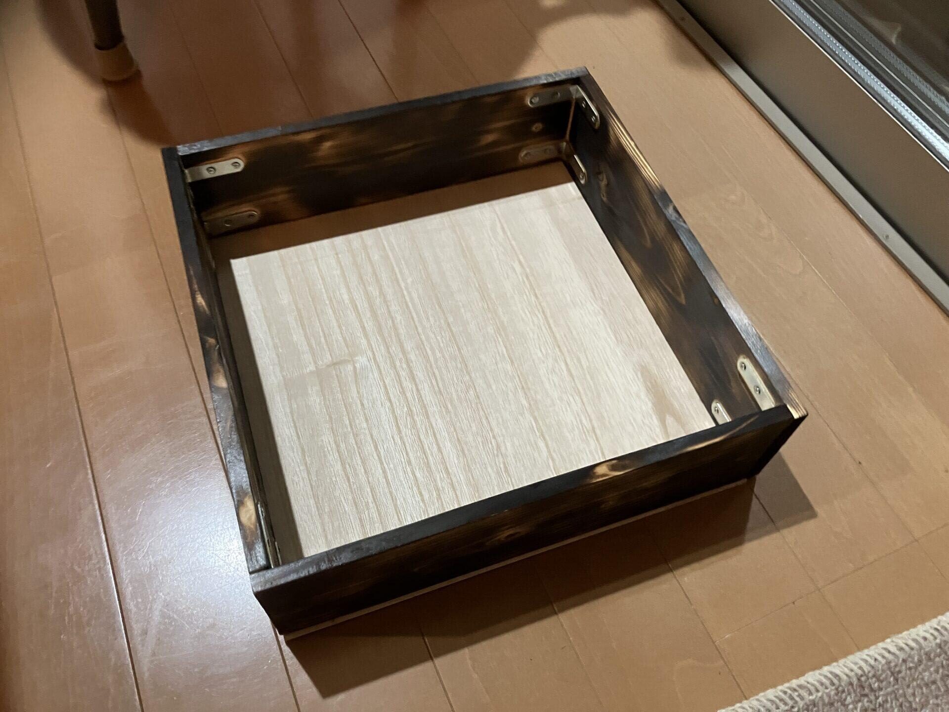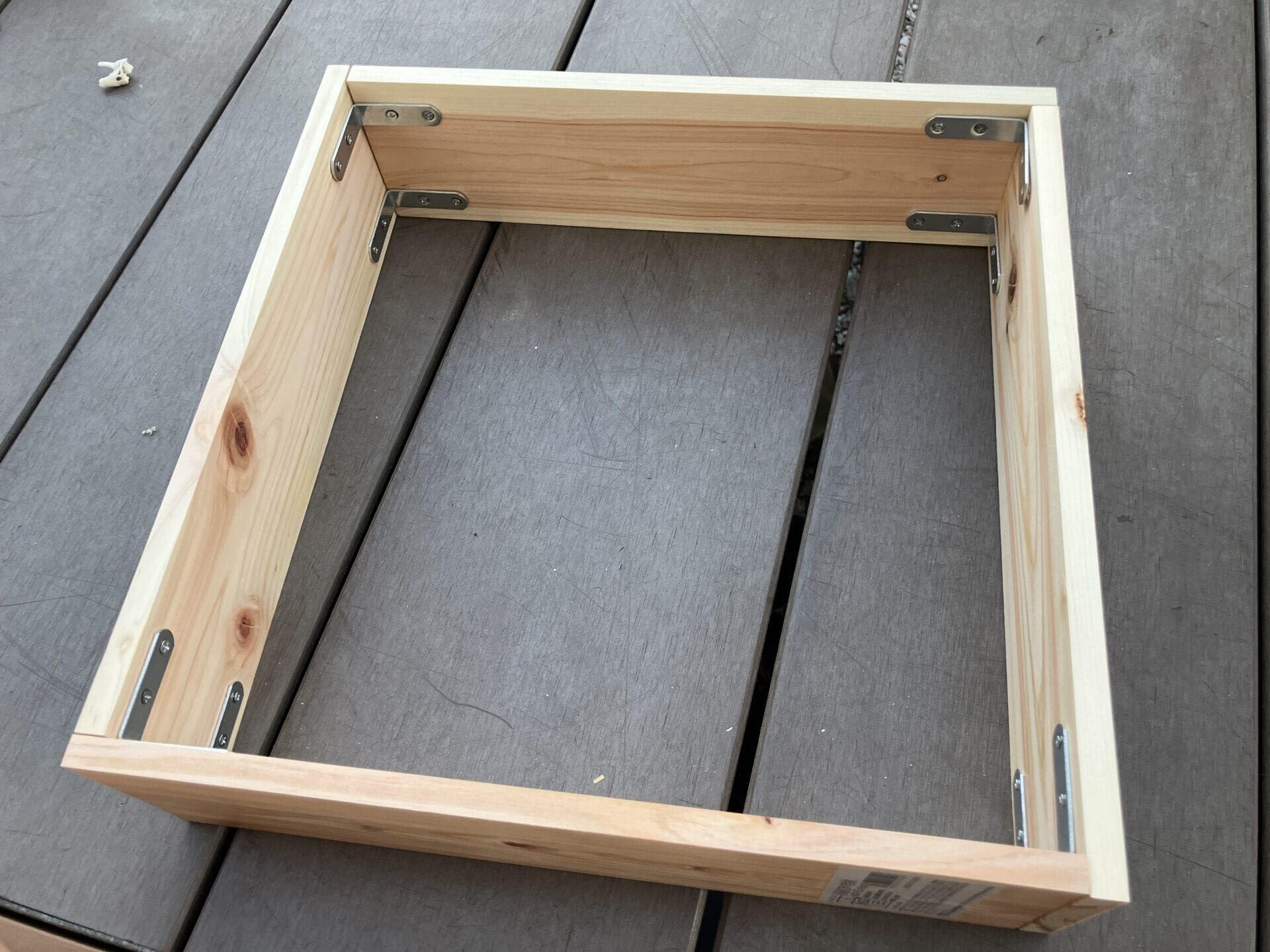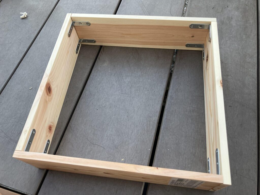 とりあえず竹が近所にあるのでそれらを詰め込んだ箱を作ることにしました。枠となる材料を100均(セリア)から調達します。枠は檜なので虫よけ効果?があるから適さないかとおもったりしたが、気にせず使用。サイズは縦横30㎝、奥行8㎝。