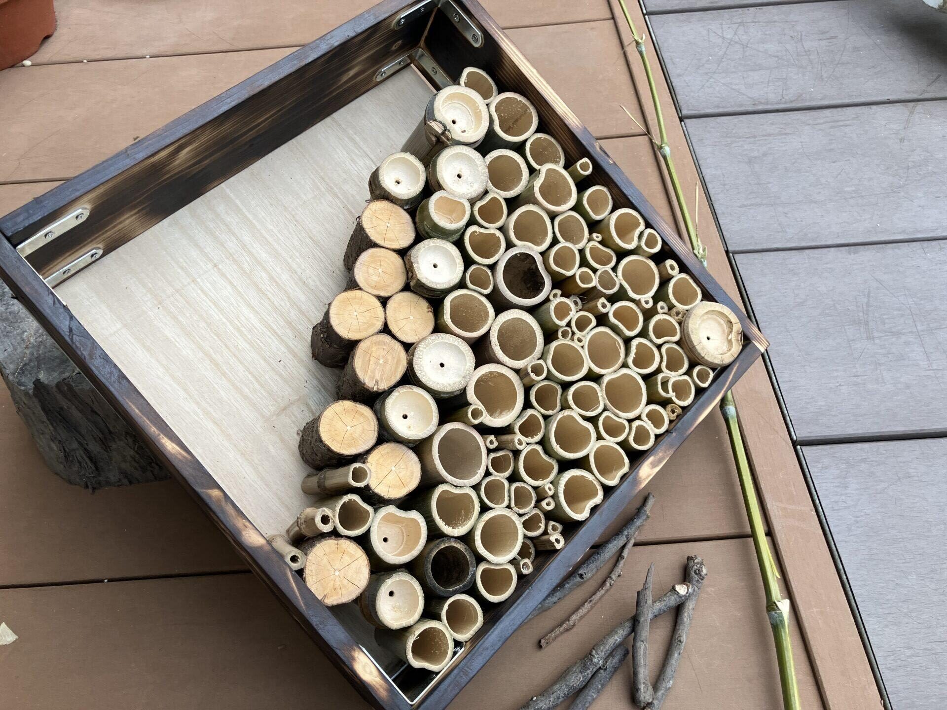 今回は100円ショップの木材を利用してバグホテルを作ってみました。とにかく隙間があれば何かしらの虫が入ってくれるはずです。気になるのが枠の板が幅が8.5㎝と若干せまめだったこと。次つくるなら10cmでやりたい。