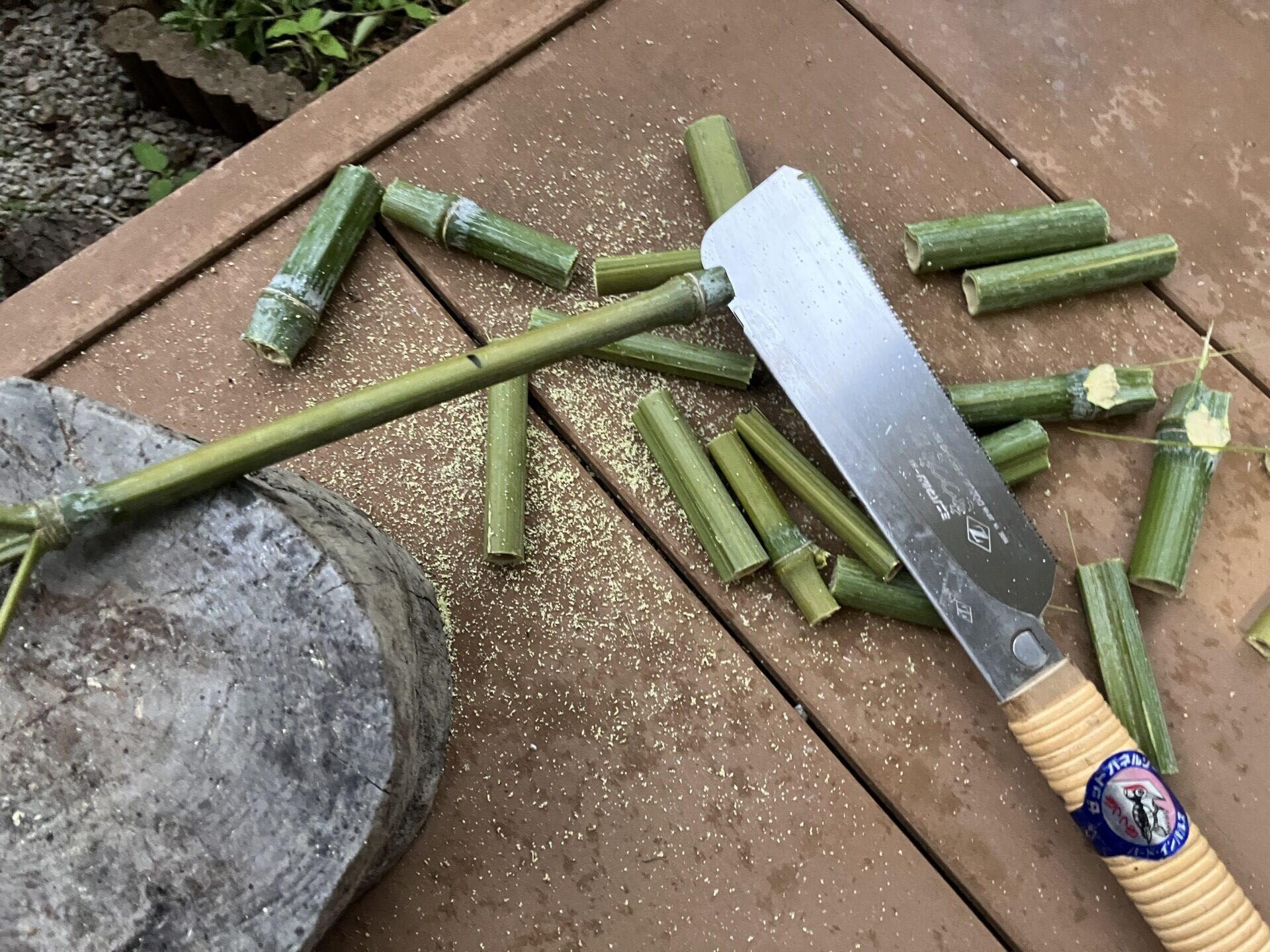 ノコギリはなるべく目が細かいのが竹に適している。枝を落すのは斧かナタが適している。