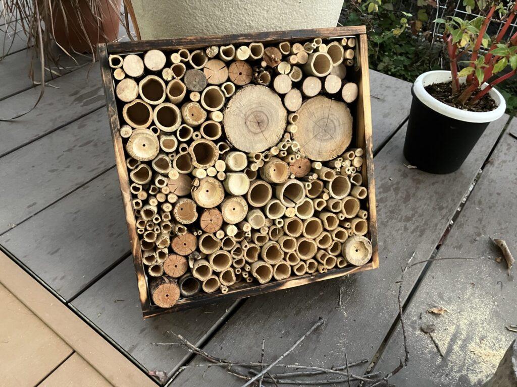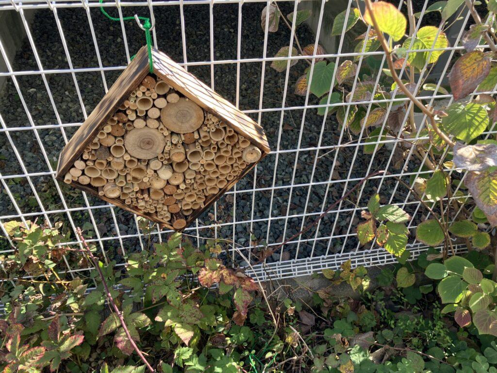バグホテルについては特に呼びたい虫がいない限り正解は無いと思うので、適当に作ってみたらいいでしょう。使う素材も他にも色々使えそうです。1年後どうなってるか。置き場所や作り方によってはカエルやヤモリとかも住み着きそう。ビオトープのそばに置いたら楽しいかも。