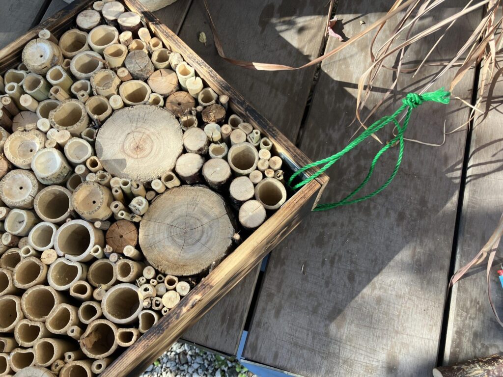 しかしながら中身を詰めるのが大変でした。かなりの数をノコギリで切りました。同じ長さにしたほうが綺麗でしょうね。ハチが住んでくれたら嬉しいです。今から寒くなるので他の虫も来るはずです。地面近くにつながっていたらいろんな虫が来そうですが、高さ1mのところに吊るしているので羽があるムシが来るんだろうと予測します。もしかしたらヤモリもくるかも。