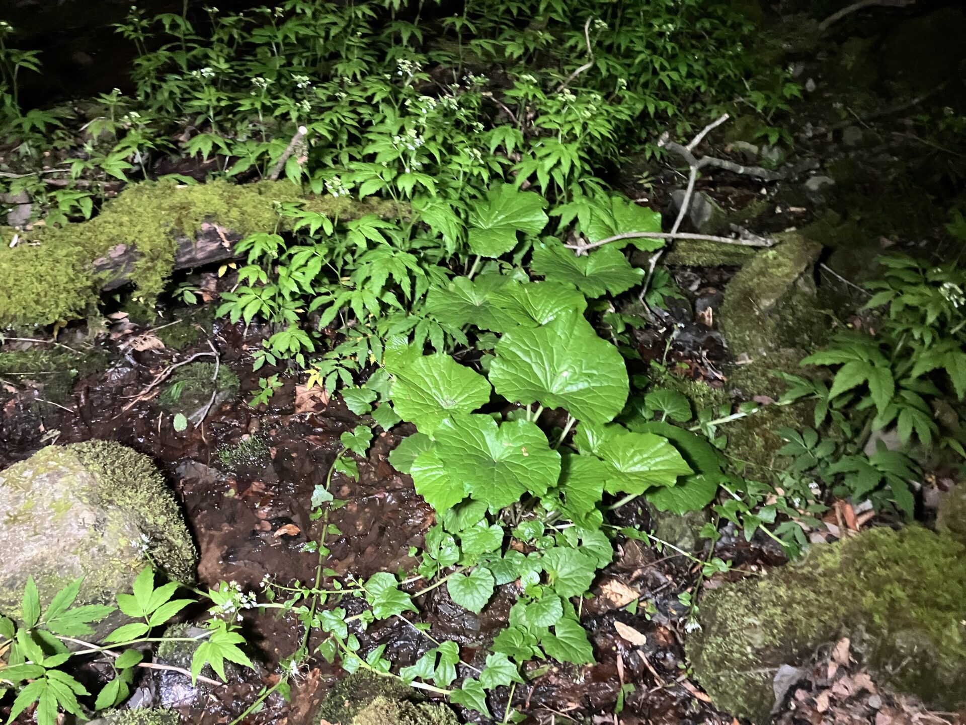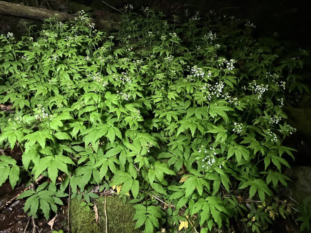 山野草の群落や天然ワサビを見ながら下る。落ち葉や浮石スポットではサンショウウオ堀も行う。うーん。何も見つからない。時々ムカデが掘り出されるくらい。