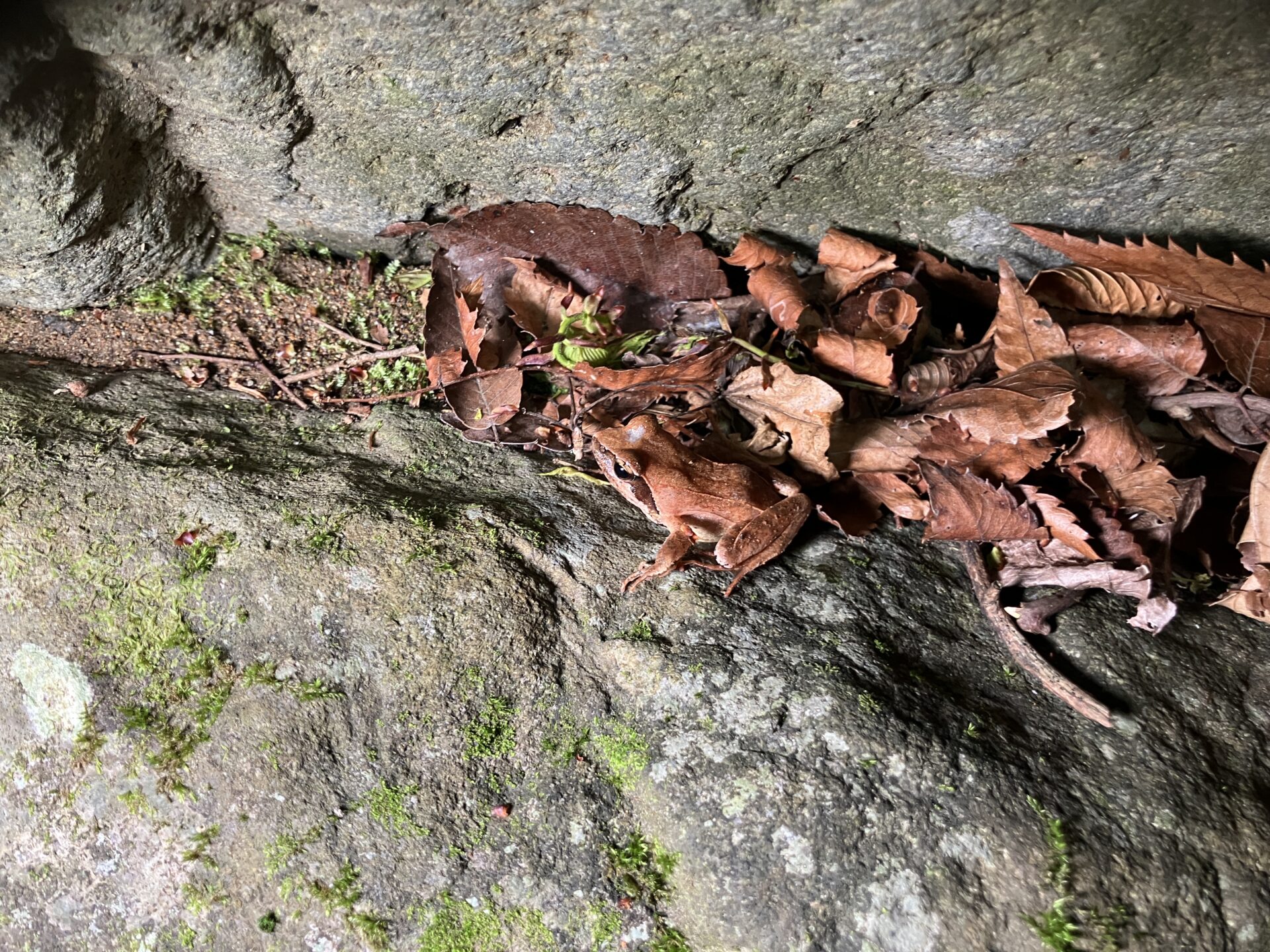 沢の中を見るだけでなく、朽ち木や石をひっくり返して戻したり、落ち葉が溜まったところで少し掘る「ウオホリ」もやりながら降りていく。以前は幼体が一匹見つけた方法だけど、今日は成果なし。